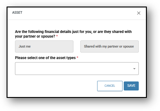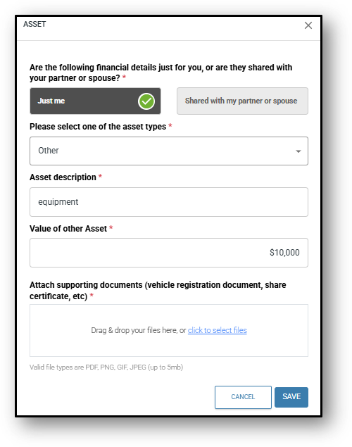 Users can add assets for the business (Sole Trader, Partnership, Company) by clicking the blue ‘Add Assets’ button. Initially there will be two questions to answer (Aggregation and Asset Type) and this will expand further depending on the asset being added. To help with pre-population and documents scraping, the user will be asked to upload the relevant supporting document.