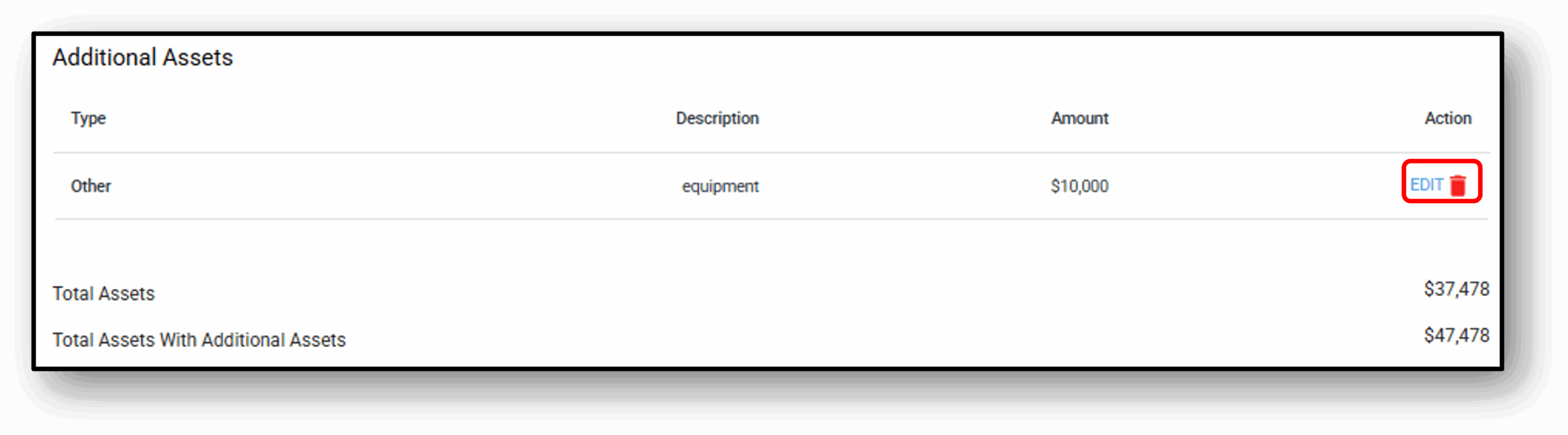 A user can edit additional assets that have been added for the business by scrolling down to the bottom of the balance sheet.
