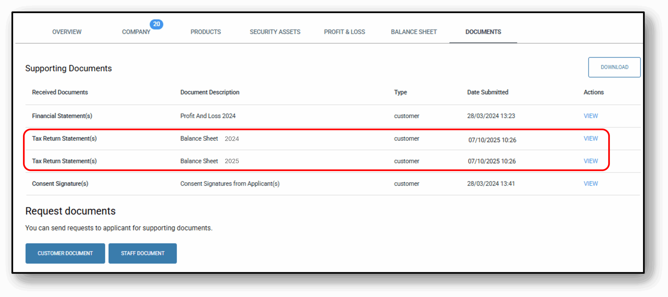If the user needs to upload the businesses tax return/s, this can be completed through the ‘Documents’ tab.