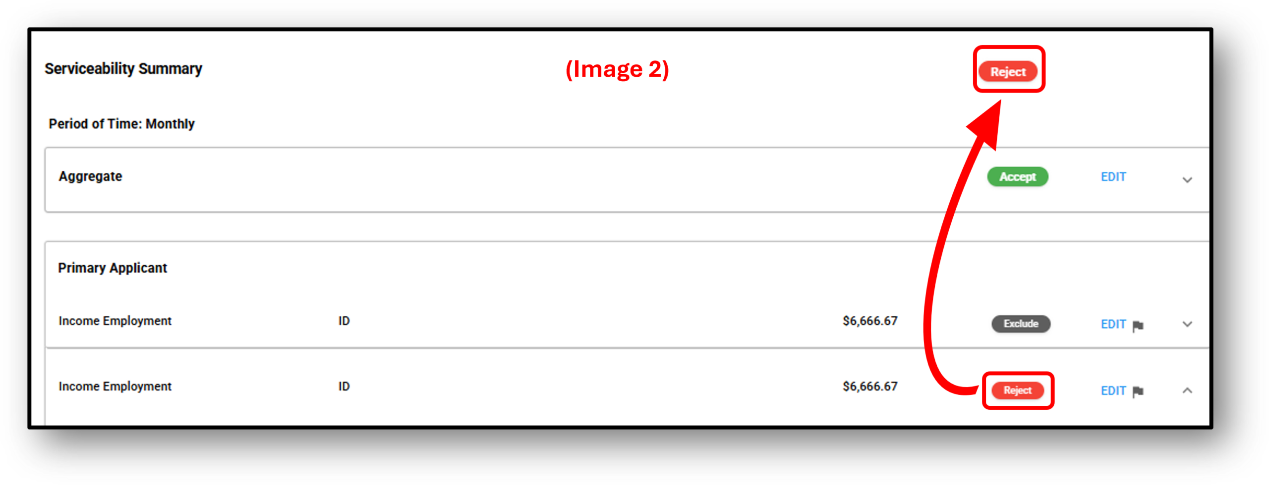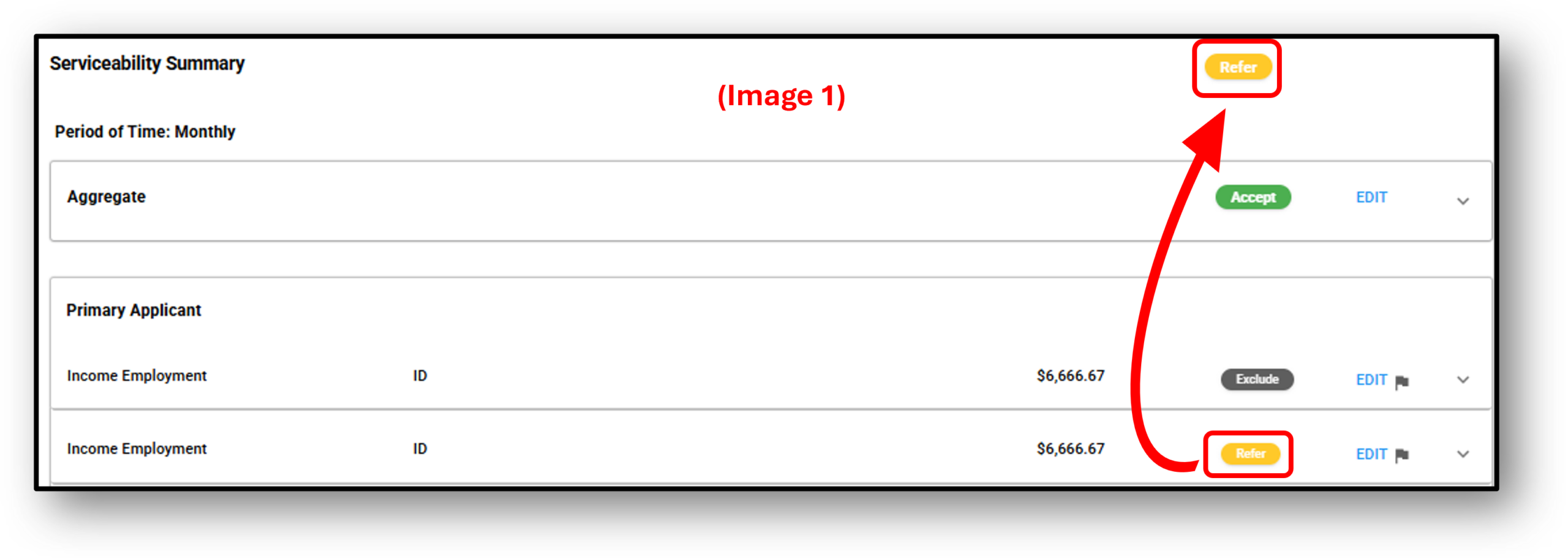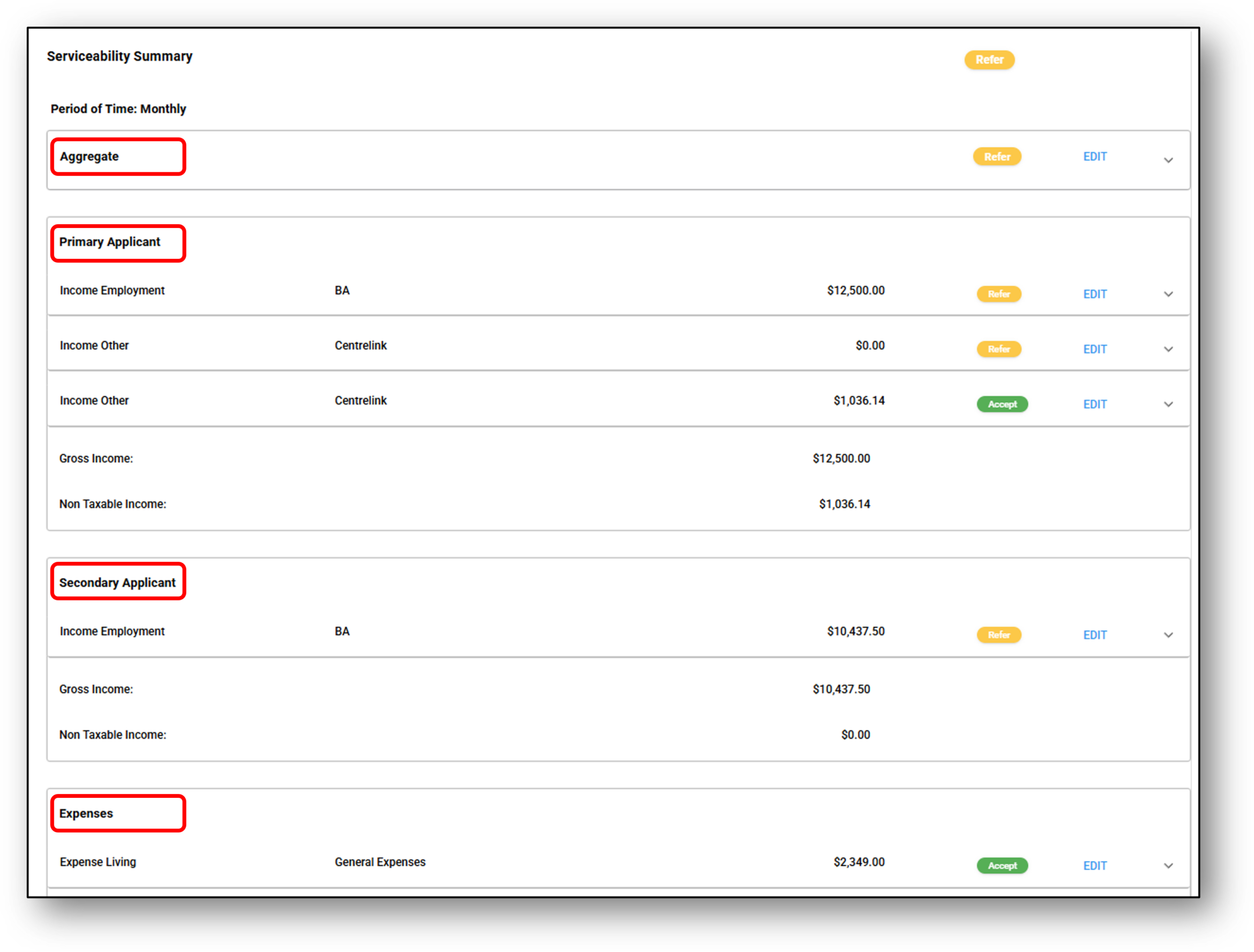 The Serviceability Summary status is controlled by the individual statuses of the 3 aforementioned sub-sections (Aggregate, Applicant & Expenses), meaning, if one section requires the application to be ‘referred‘, then the Serviceability Summary will say ‘Refer‘ (see Image 1 below). Alternatively, if one section shows ‘Reject’, the the Serviceability Summary will say ‘Reject’ (see Image 2 below).