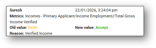Type your reason in for the change. For example – Checked with Credit team and the applicants income has been recorded manually after the assessment rules run. Then press ‘Save’ and the new status will be updated and reflected immediately. A ‘Manual Evaluation Note‘ will be left in the system (see image below).