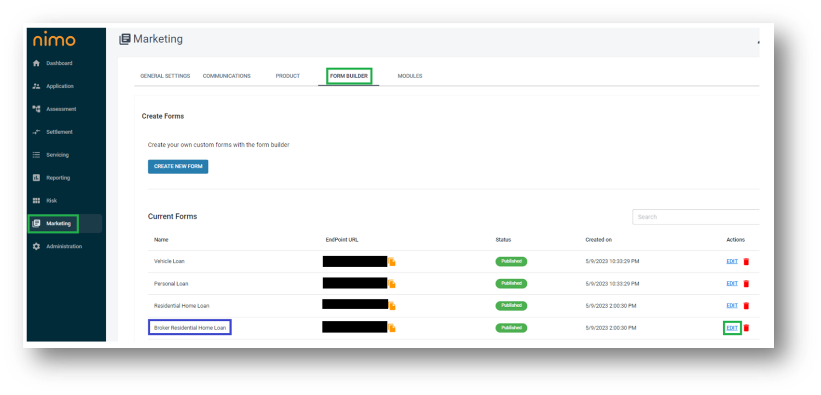 - Find the application form you wish to assign to the broker and click the EDIT button.