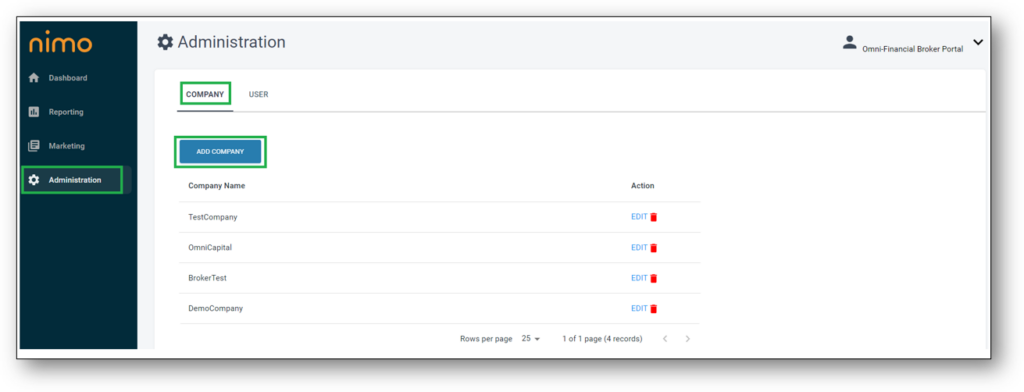 - This will bring up the interface to add companies and new broker users.