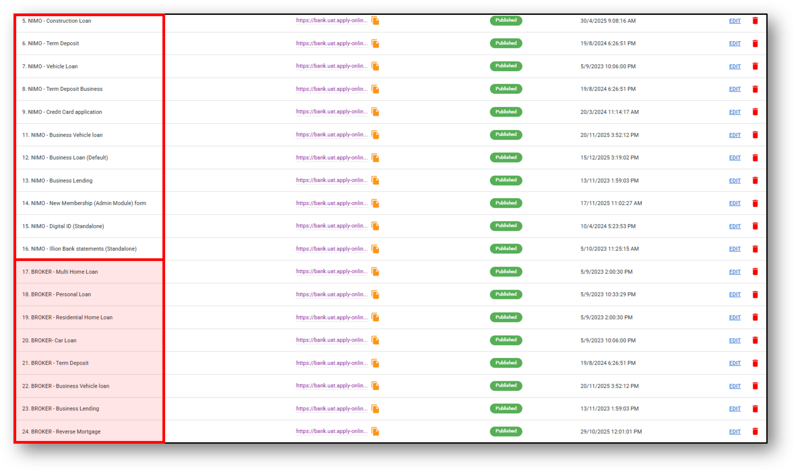 The example below illustrates the staff’s forms (NIMO) have been duplicated and relabelled with the word ‘BROKER’ placed in front of the lender forms.