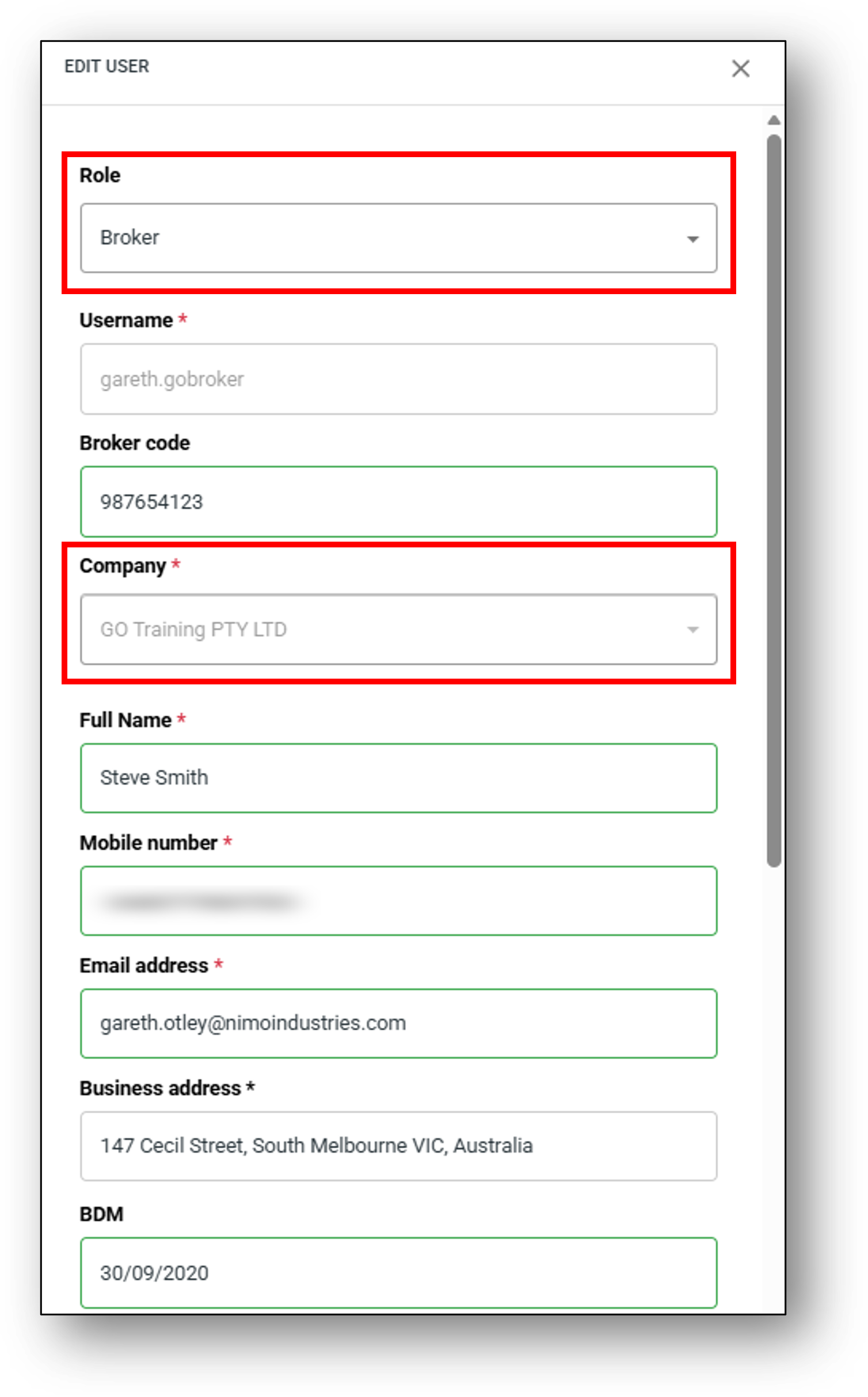 - A pop-up will appear to enter the broker details to set them up as a user (IMAGE 1 & IMAGE 2 below). This will include assigning them to a company they are associated with (created in the company setup step), and their role will be set to Broker as highlighted in the image below.