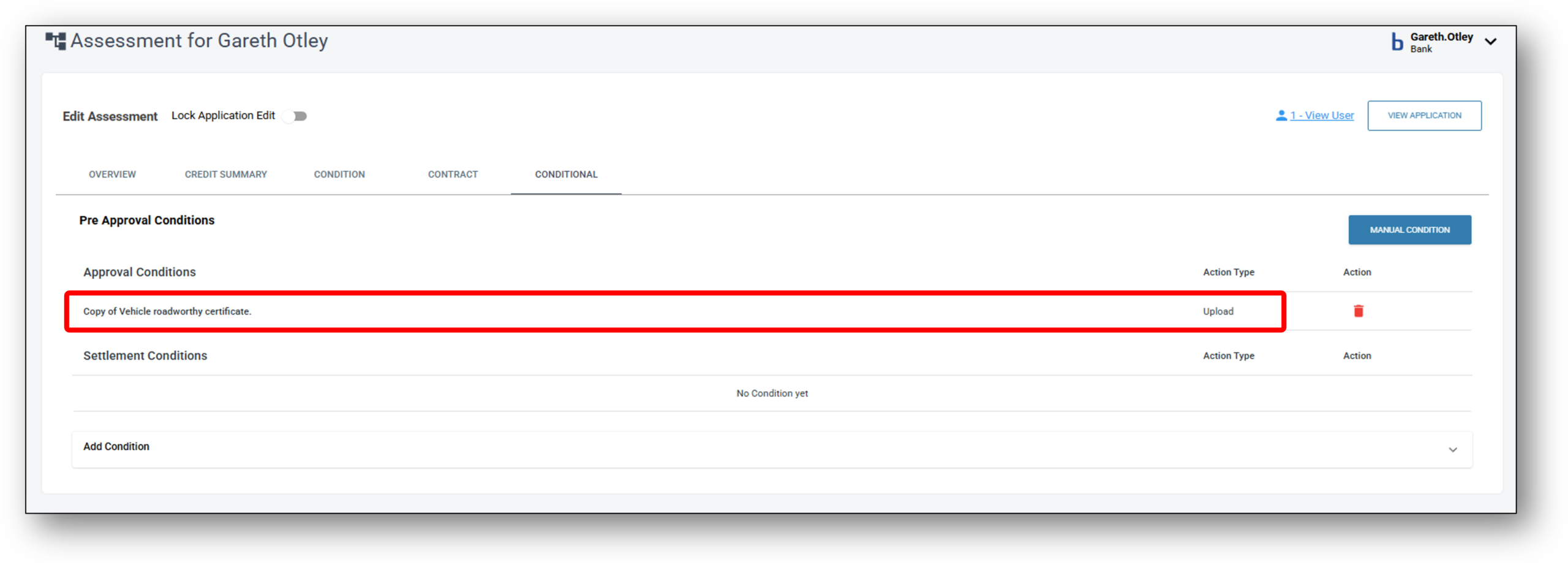 - Adding Conditions: During the assessment stage, conditions can be added to the application. These conditions can be manual or pre-filled and may require actions such as document uploads by the customer or staff.