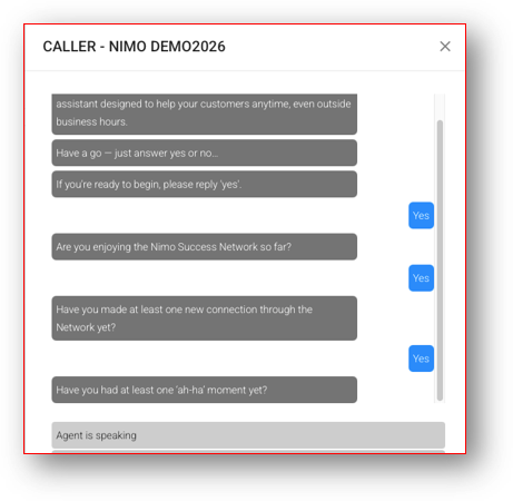 Each question is delivered visually (in a chat style bubble) and via an AI voice (Text-To-Speech). Users respond by speaking or tapping their response from the available options. The system detects input and proceeds automatically. No “Next” buttons, no manual progression. If the response isn’t a ‘Yes‘ or ‘No‘ then it will ask the questions again.