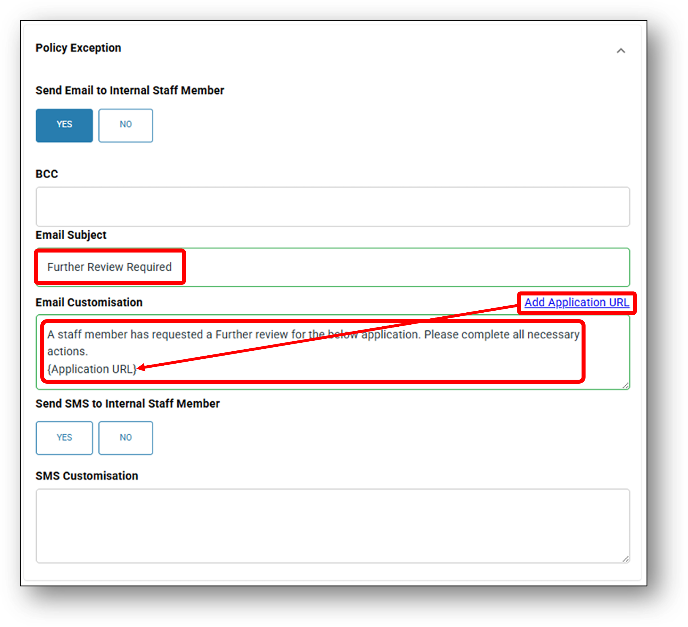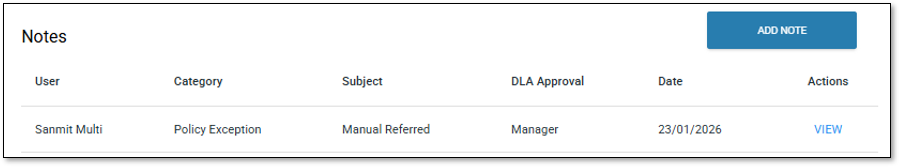 This sends an email notification which is configurable in the Marketing layer > Communications tab > Internal tab> Policy Exception accordion (see Image 4). When the email is sent to the nominated staff member, a note is also left on the Overview tab (see Image 5).
