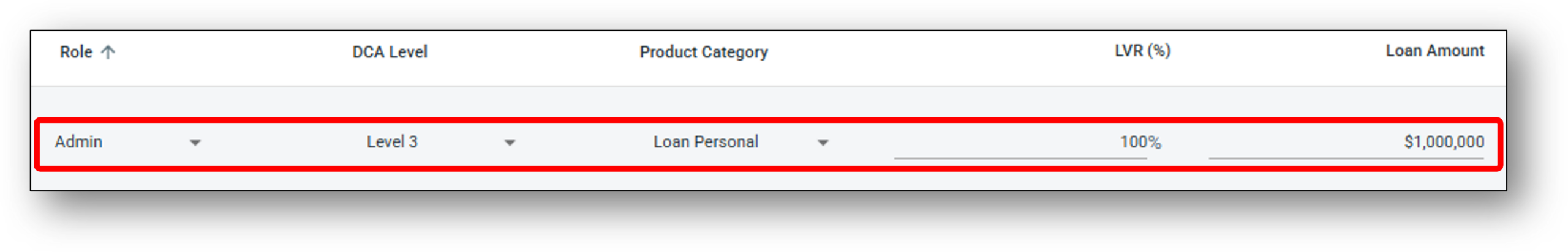 The DCA tab enable your organisation to set and manage the Loan Approval stages through the setting of rules based on assigning Specific levels of approval to different levels of DCA holders. As a basic example, if we look at a Credit Role and two different users, we might set one user as Credit (role type), Level 1 (DCA Level) on the Loan Business (Product Category). For the next two settings we can choose to control their LVR % and their approval amount (Loan Amount) based on their qualifications as a lender. The below image demonstrates this.
