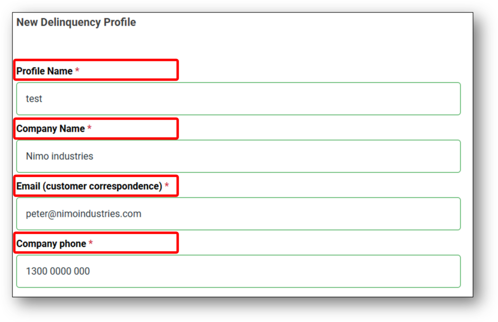 When you create a new delinquency profile, the detailed configuration view will open. All fields are pre-populated based on the selected template (if one was used), otherwise the organisation’s details will need to be entered for the customer communications. Users will be able to customise each section as needed to fit their specific requirements.