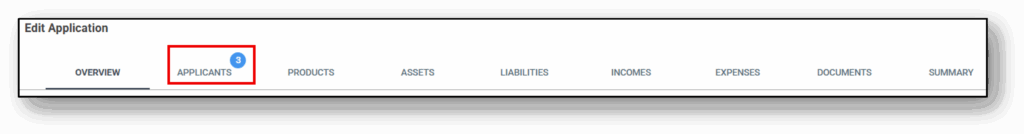 The Applicants tab is specifically designed for viewing and updating applicant details, or for adding an additional applicant to the loan application.