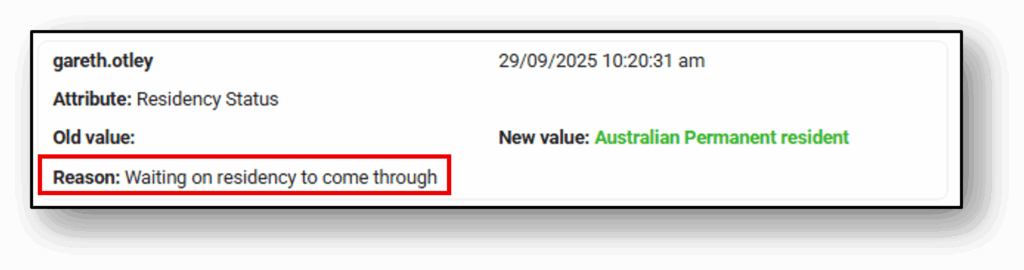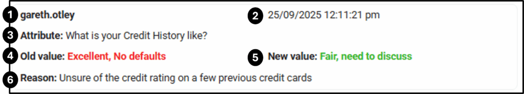 Once entered and saved, a change log record is generated, displaying the old and new values and the reason for the change.