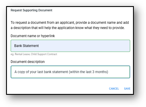 Step 1: Click the button and type in the type of document you require e.g. ‘Bank Statement’ or ‘Payslip’. Write a short description for the customer that might contain some key details as to the type of document (e.g. ‘Within the last 3 months‘ or ‘your most recent statement‘).