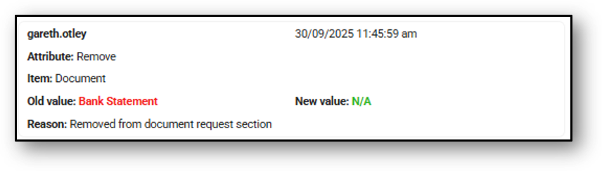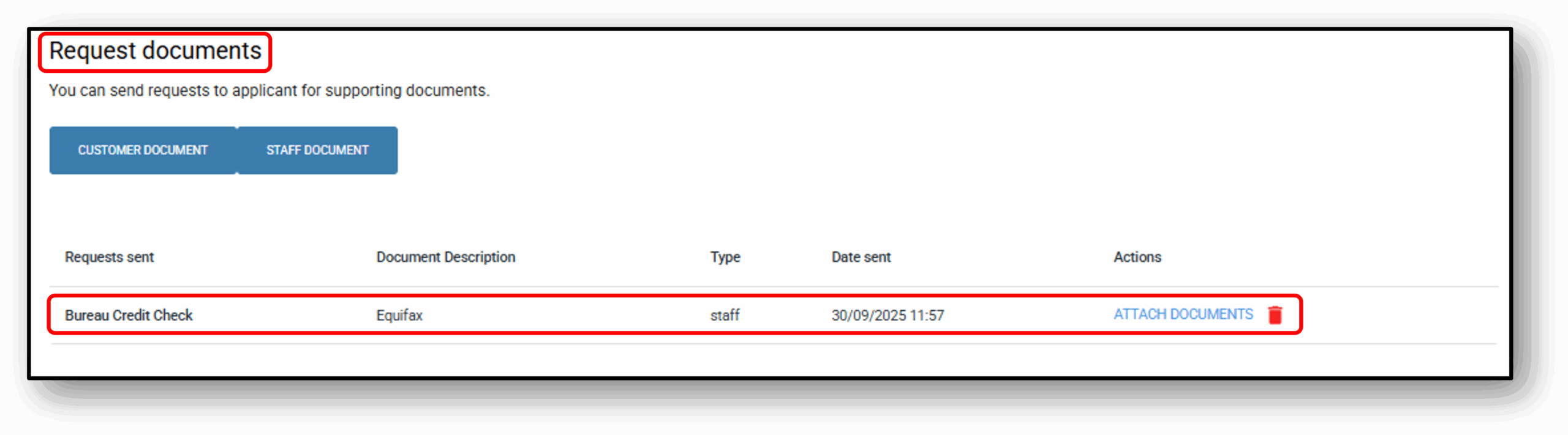 The document will now appear back in the ‘Request documents’ section of the tab awaiting for the correct document to be attached to the loan. Alternativel, it can be further deleted from this section if no longer required.
