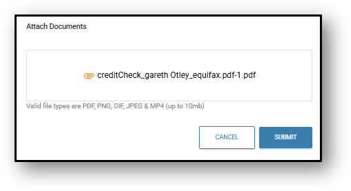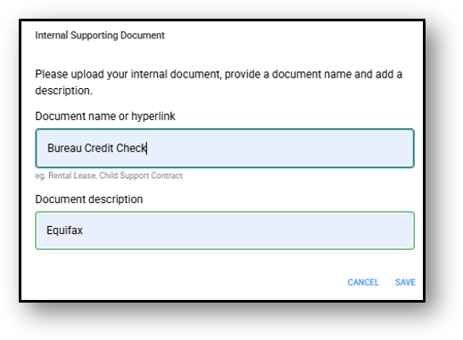 Step 1: Click the button and type in the name of the document e.g. ‘Bureau Credit Check’ as well as a description that provides further context to the document e.g. ‘Equifax’.