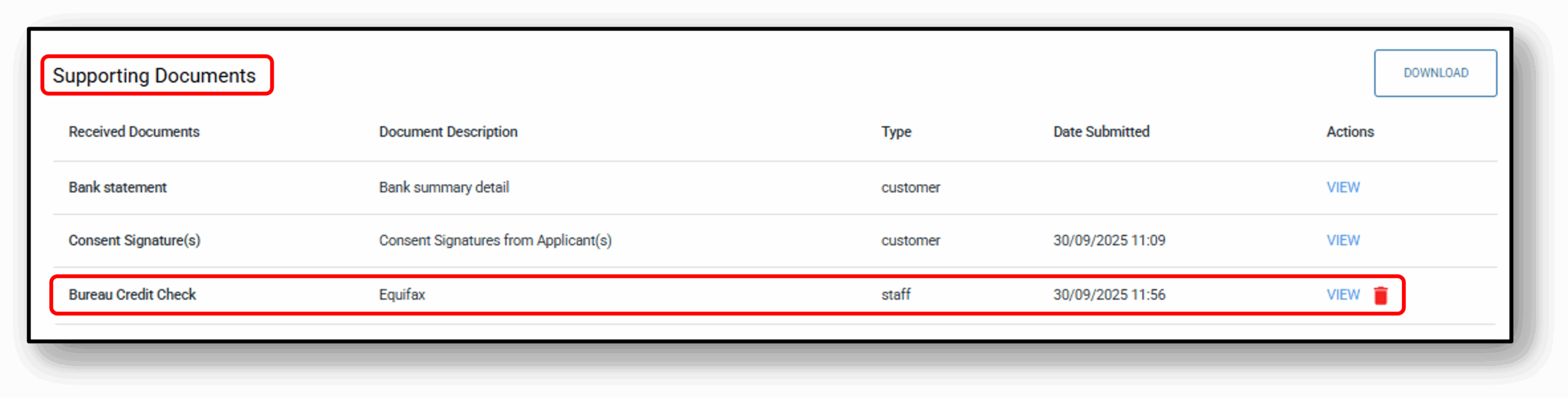 In this section you can view the document if needed, simply by clicking the hyperlinked ‘Edit’. The document will appear again in your download section. A user can also delete an Staff uploaded documents that aren’t required by clicking on the red rubbish bin icon. The user will be prompted a second time for confirmation to uncomplete the request to add the supporting document to the loan application.