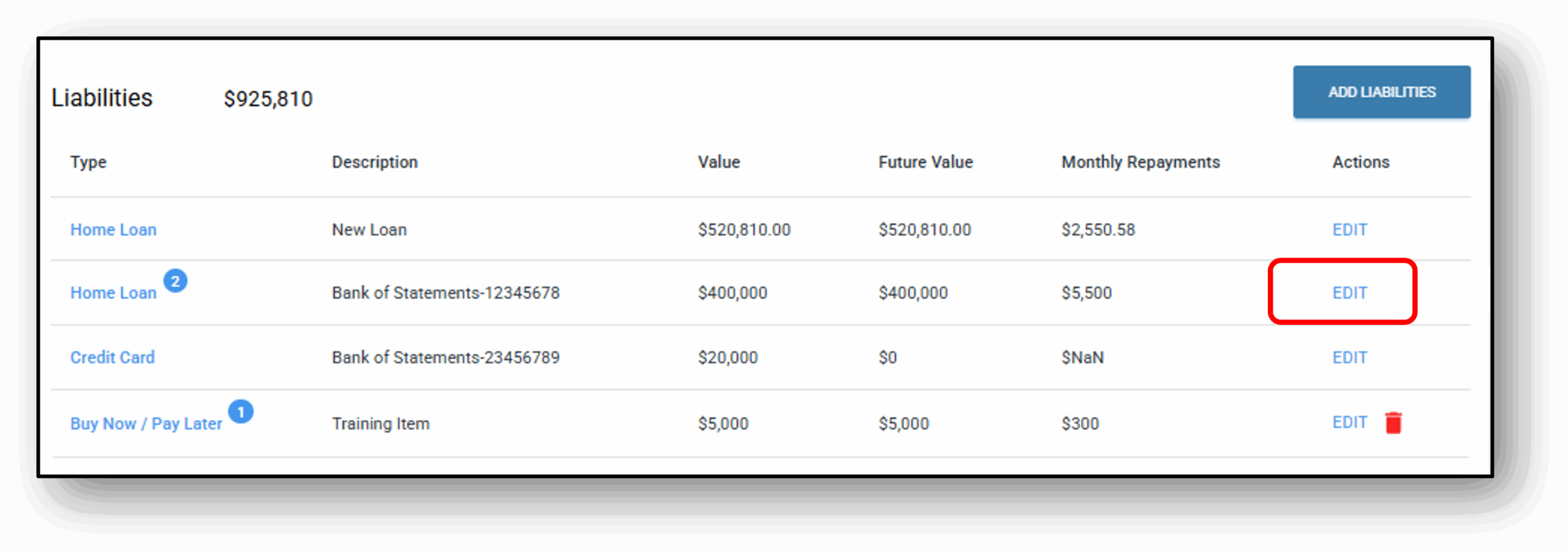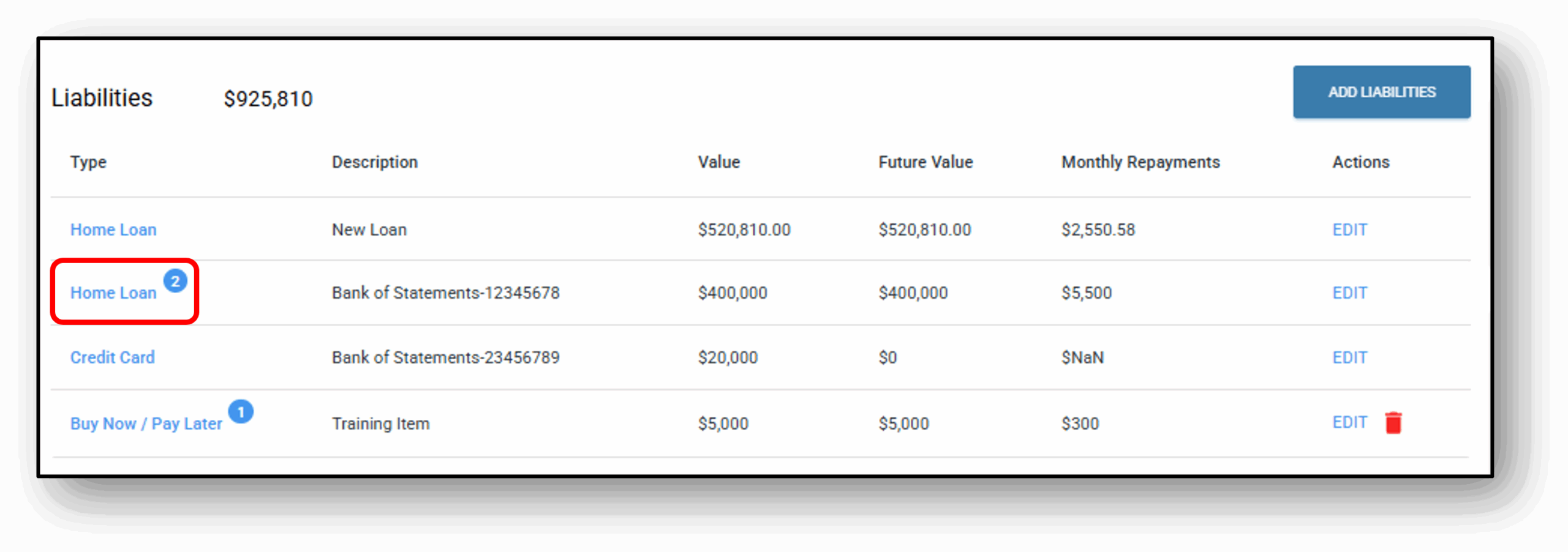 The Liabilities section lets the business view/review all liabilities held by the applicant/s, including the current loan they are applying for.